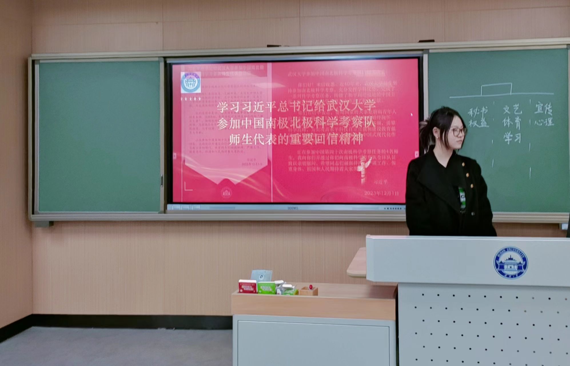 随后,李靖怡带领大家一起学习习近平总书记给抖阴 参加中国南北极科学考察队的回信精神。她提出作为学生会成员我们要将习近平总书记的殷切嘱托转化为刻苦钻研、积极进取的实际行动学习贯彻习近平总书记的重要回信精神发扬艰苦奋斗、服务大众的工作作风。